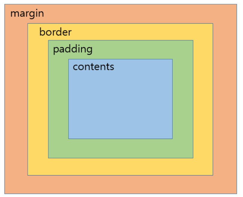CSS 박스는 4개의 영역으로 이루어집니다. 각 영역은 콘텐츠(contents) 영역, 안쪽(padding) 영역, 테두리(border) 영역, 바깥(margin) 영역이라고 부릅니다.